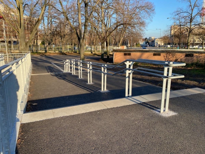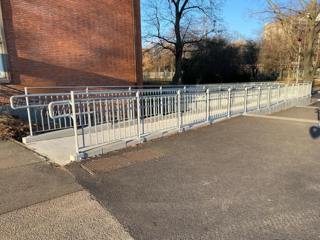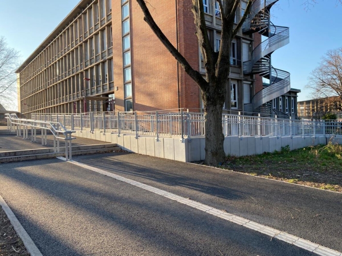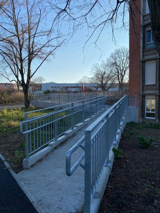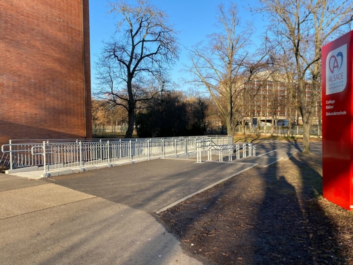 Fabrication et pose d’un ensemble de 75m de garde-corps, avec double main courante, protégeant une rampe d’accès pour personne à mobilité réduite (rampe PMR), ainsi qu’une double main courante centrale sur pied, pour le lycée Kleber à Strasbourg.