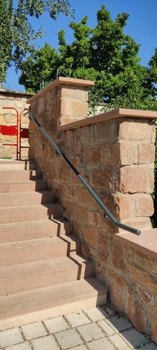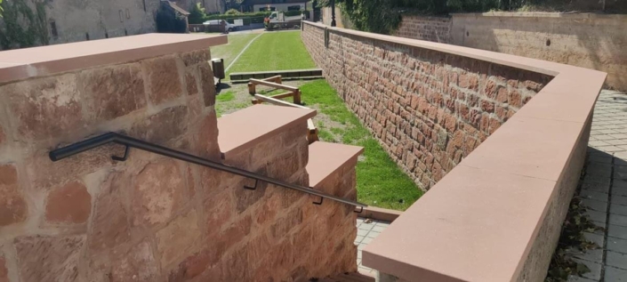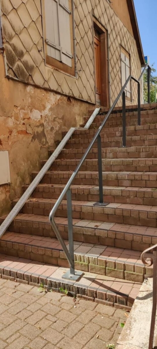 Dans le cadre du réaménagement du parking des Remparts à Bouxwiller, nous avons réalisé une main courante centrale sur pieds, une goulotte pour vélos et d’autres mains courantes le long de l’escalier donnant sur le parking.